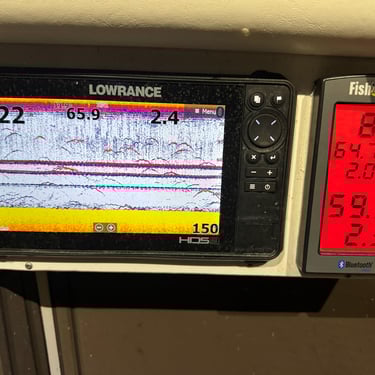 We set lines with machine-like precision—15 rods out, not a single bite. Screen lit up with marks…fish everywhere, eating everything except our stuff. I don’t think Logan was used to this – I am!