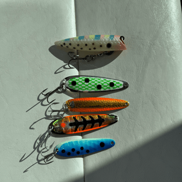 The plan: Stick to the plan. (Which is what we say when we don’t have a better one.) We ran north and set up in 60 FOW, about 1.5 miles south of the bath house. The screen was lit up — bait, hooks, promise, hope. Logan nailed the location, of course. Two riggers, one diver, six leadcore. All killer stuff! And then… nothing. Like, zero. Zilch. The lake just ghosted us. We had the best lure lineup money can buy, plus a few of Logan’s secret “you can’t buy this anywhere” custom jobs. Still nada.