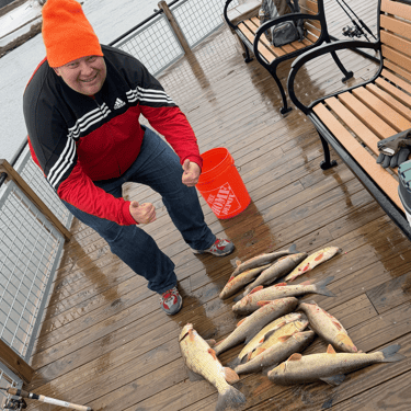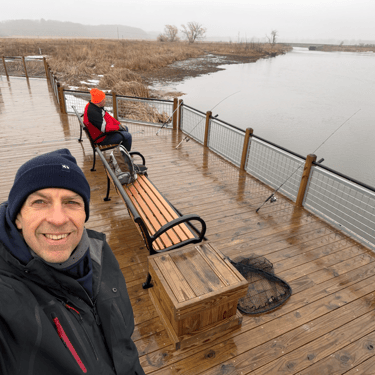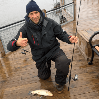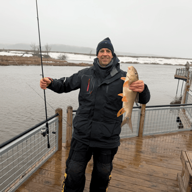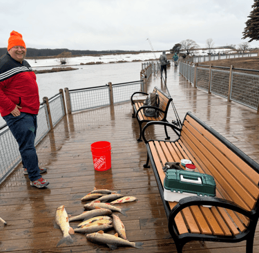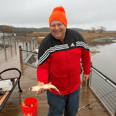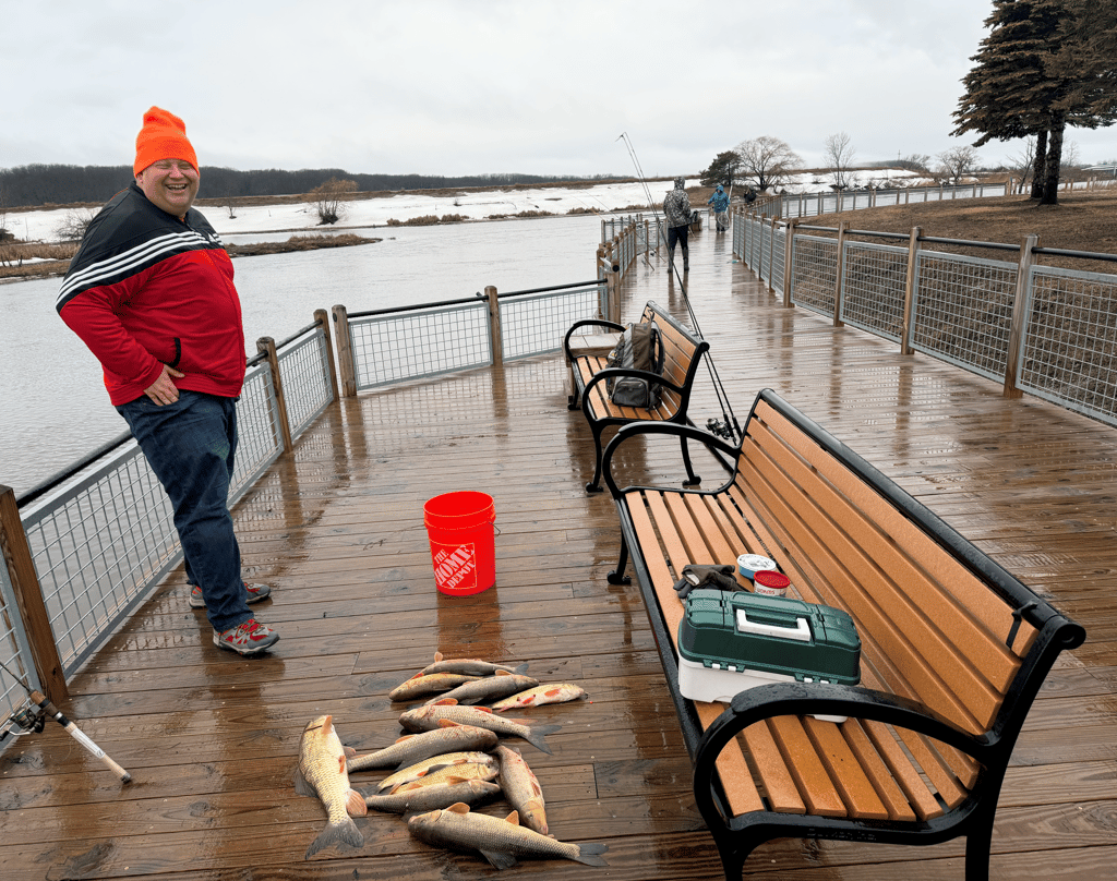 Arthur’s family was going fish for fish with us most of the afternoon. My rotten worms worked great. My hands were frozen. And I landed not one but two Master Angler class suckers. Two different species even. Hog hunting people!